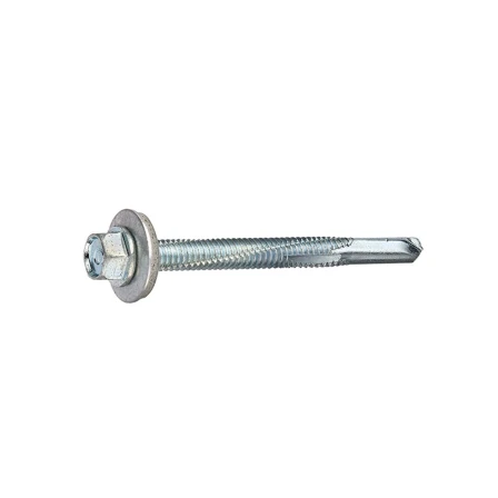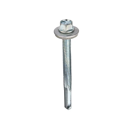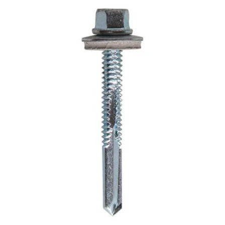 Pack of 100 self-drilling Tek screws engineered for fastening metal sheets to hot-rolled steel sections ranging from 6.0 mm to 12.5 mm thick. Features a bonded neoprene washer to ensure a watertight seal. No pre-drilling required. Designed with a fine self-drilling thread (24 TPI) for heavy-duty steel applications and a No. 5 hardened carbon steel drill point. Zinc-plated for corrosion resistance and fully threaded for secure fixing.